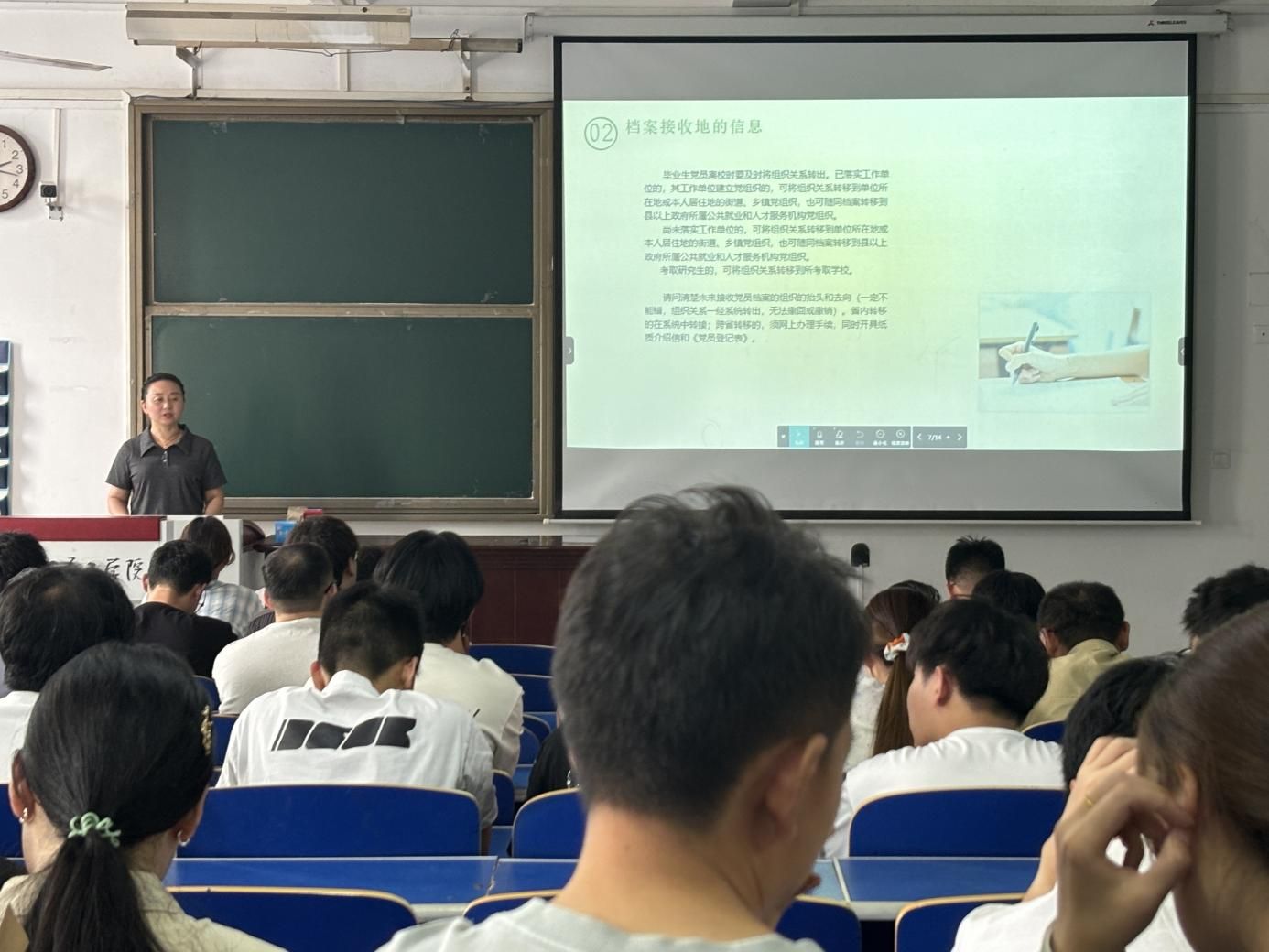 会议开始,薛松对2025届党支部毕业生进行了离校前的安全教育,分别从交通安全、消防安全、饮食安全等方面进行介绍。接着就毕业生党组织关系转接进行了详细说明。她指出党员档案是证明党员身份和组织关系的重要依据,必须严格核查,确保真实、完整、准确。然后就档案核查工作、档案接收地信息、需要上交材料、注意事项等方面作一一讲解最后,指出转出党组织与接收党组织之间、党与党组织之间要保持密切沟通,及时解决转接过程中遇到的问题。