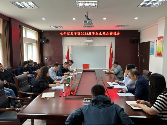 4月18日,电子信息学院召开2023届毕业生就业创业工作推进会,学院全体领导、科级干部、各系(中心)负责人、支部书记、学院全体辅导员和毕业班班主任参加了此次会议。会议由学院党委副书记王媛媛主持。